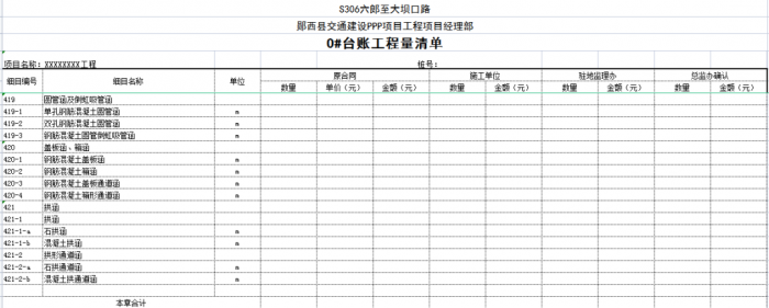 “0#”臺賬按單位、分部、分項工程劃分標準編制,可以將計量支付與質量檢驗評定有機結合起來,這樣可以使質檢、測量、實驗、計量等部門的內業(yè)工作都在同一個規(guī)則下進行,提高了整個項目(合同段)內業(yè)管理的效率。