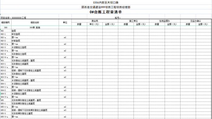 一個項目或一個合同段的臺賬由n條可以獨立計量的工程結構(單元)組成,一般情況下一條臺賬應包含子目號、子目名稱、單位、工程數量、單價、合價、里程樁號、工程部位描述、圖紙編號、備注說明等。